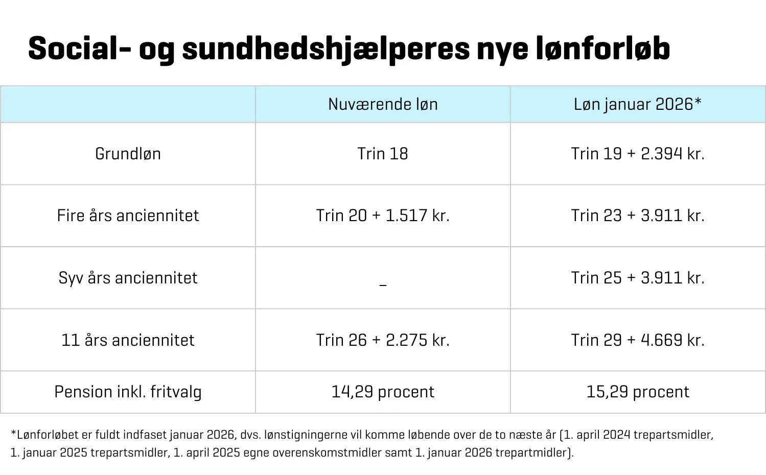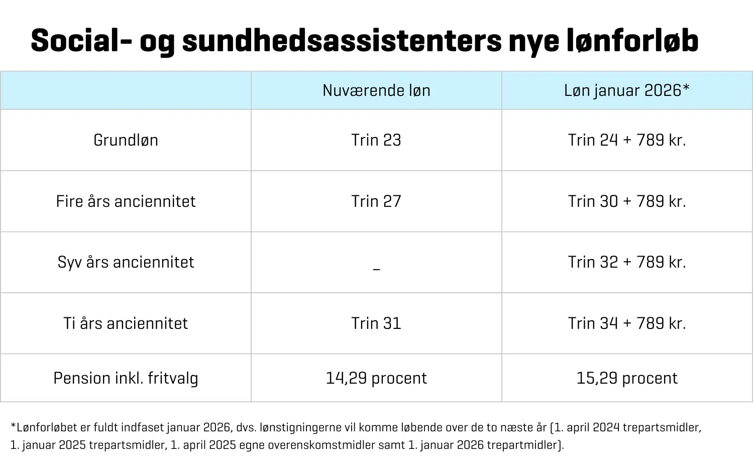 ”Social- og sundhedsassistenterne og -hjælperne får også et nyt lønforløb med en lønstigning på syvende anciennitetsår, hvor de stiger fem løntrin sammenlignet med i dag, når det er fuldt indfaset i 2026. Det er en rigtig stor sejr. Startniveauet bliver noget højere, end det er i dag, og sluttrinnet bliver noget højere. Det er blandt andet nogle af de ændringer, der er værd at hæfte sig ved,” siger hun.